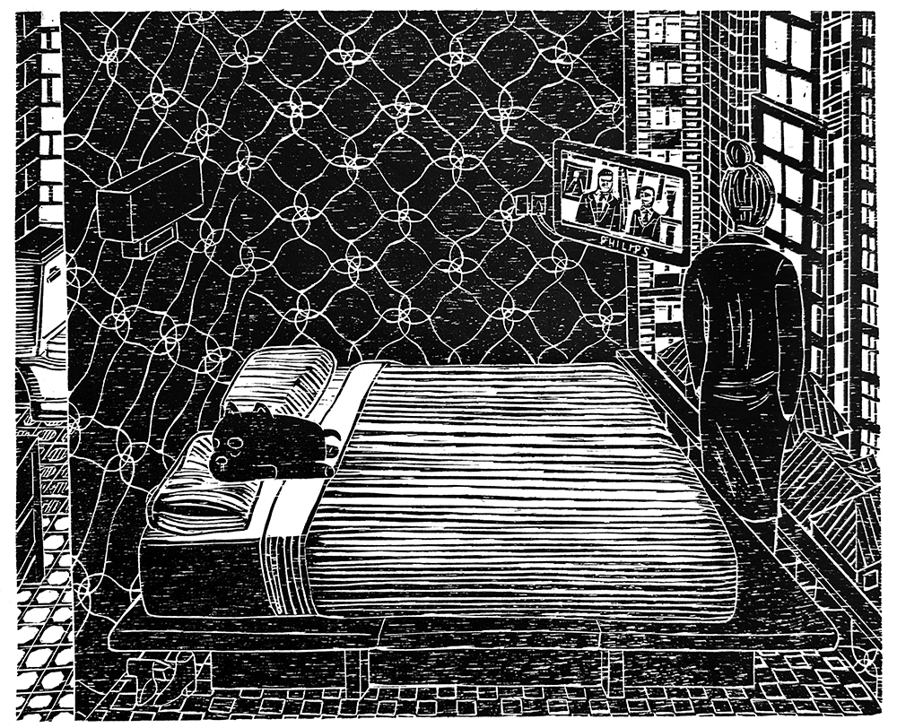 featuring a woodcut by María Marín de Orozco. Woodcut, 82 × 75cm, 2025